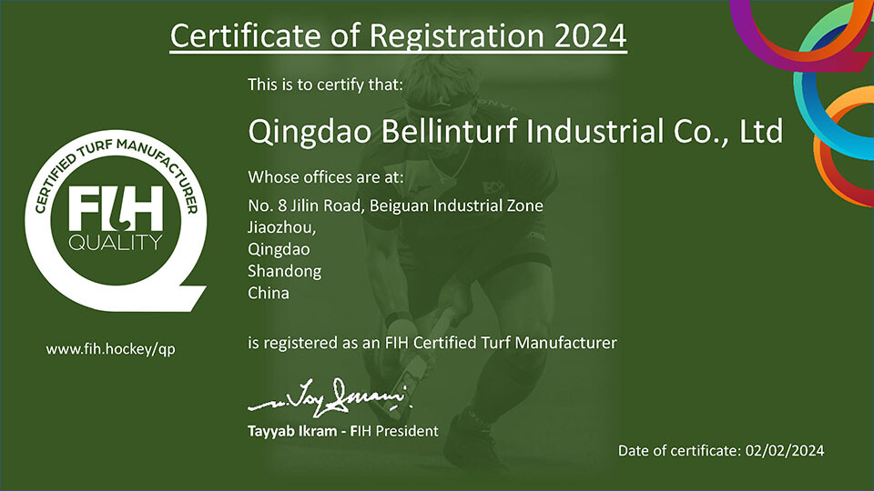 Cumpliendo con la filosofía de la compañía de la calidad en primer lugar, Bellinturf ofrece las propiedades de juego de un césped de hockey de gama alta que cumple con el rendimiento y los estándares de la FIH. Bajo una estricta inspección de calidad, Bellinturf Hockey Turf cumple con los requisitos del Programa de Calidad FIH para Hockey Turf y garantiza la protección de la salud de los atletas.
